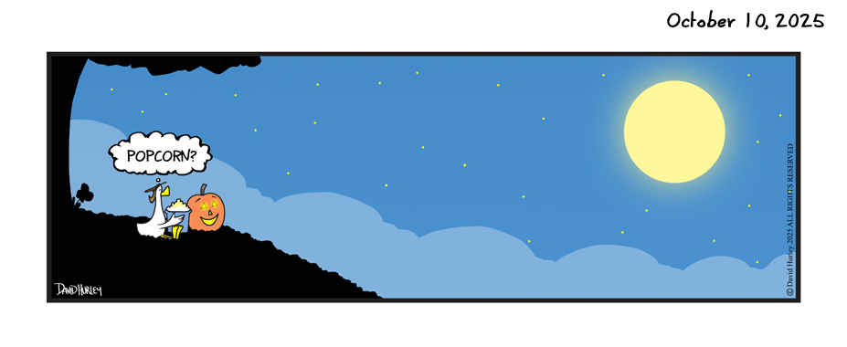 ‹‹ First‹ PreviousComments (4)Next ›Last ›› Oct 10 Popcorn By Moonlight (10102025) By David Hurley on October 10, 2025 at 12:01 am Chapter: Comic └ Tags: Cartoon, Comic, comics, David Hurley, Don't Pick the Flowers, Don't Pick the Flowers Comic, dontpicktheflowers, Duck, Humor, Jack-o-lantern, Pumpkin Related Comics ¬ They Grow Up So Fast (04202026) No Day To Race (04172026) Cloud Bath (04152026) Moon Quack (04132026) Waddle (04102026) 4 Comments Pumpkin spice flavoured? Reply And butter on top! Reply At this time of year, most Jack-o-Lanterns are asking for popcorn balls. Reply That is true! Reply Leave a Reply Cancel replyYour email address will not be published. Required fields are marked *Comment *Name * Email * Website